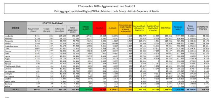Il Ministero della Salute ha reso noti i dati dell’epidemia da Covid-19, aggiornati al 17 Novembre, tramite il consueto bollettino.