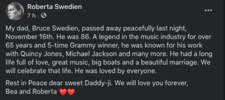Roberta Swedien, sua figlia, lo ha voluto salutare così attraverso un post pubblicato su Facebook: “Ha avuto una lunga vita piena di amore, musica fantastica e un bellissimo matrimonio… è stato amato da tutti“. Tra gli altri artisti con i quali Swedien lavorò citiamo Mick Jagger, J-Lo, Paul Mc Cartney e Donna Summer.