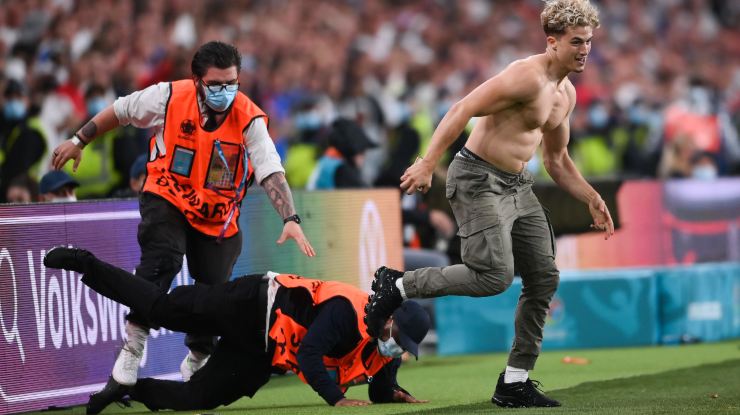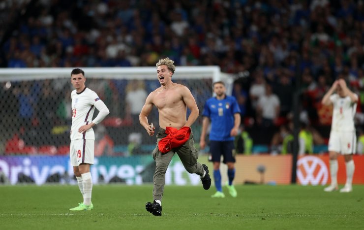 Numerosi i controlli a Wembley durante la partita e consistente il numero di steward messo in campo per evitare qualsiasi imprevisto. Qualcosa però è andato storto ed ecco le immagini dell’invasione. Tra la sorpresa e le risate dei tifosi, un uomo è riuscito ad entrare in campo, fermando per qualche istante il match.
