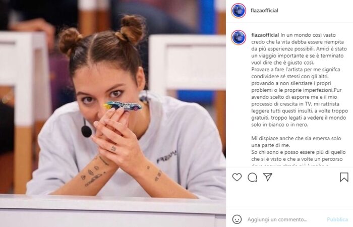 La prima volta che Flaza si è vista sospendere la maglia aveva avuto una reazione molto forte pensando che la redazione avesse preso soltanto parte di quello che era successo per farla risultare male agli occhi del pubblico. Dopo la sua eliminazione, ad ogni modo, la cantante ha voluto scrivere un messaggio dal suo profilo Instagram.