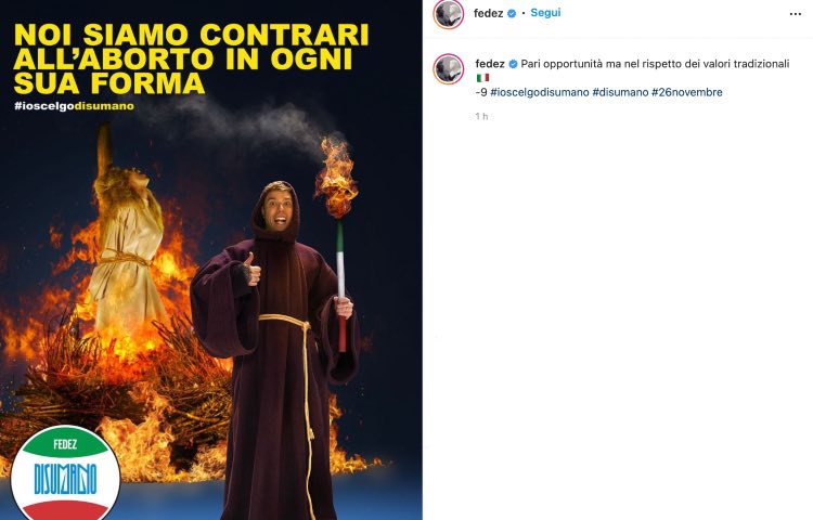 Una scena terrificante per la nostra televisione, che Fedez ha ripreso in versione eresie medievali nel suo ultimo manifesto da propaganda politica. Il rapper si è mostrato con tanto di tunica, con alle spalle una donna al rogo e a caratteri cubitali le parole di Signorini. In didascalia scrive: “Pari opportunità ma nel rispetto dei valori tradizionali”, con tanto di bandiera dell’Italia.