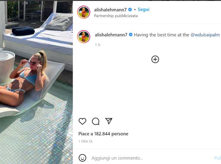 La giocatrice della nazionale svizzera si è goduta un po’ di sole a bordo piscina. Occhiali scuri, bikini e fisico colpito, Alisha ha conquistato i suoi fan anche nella versione vacanziera. Il post è stato preso d’assalto da una pioggia di like e cuori. In poco tempo ha conquistato oltre 200 mila mi piace. “Passando dei bei momenti al W- Dubai The Palm” ha scritto l’attaccante