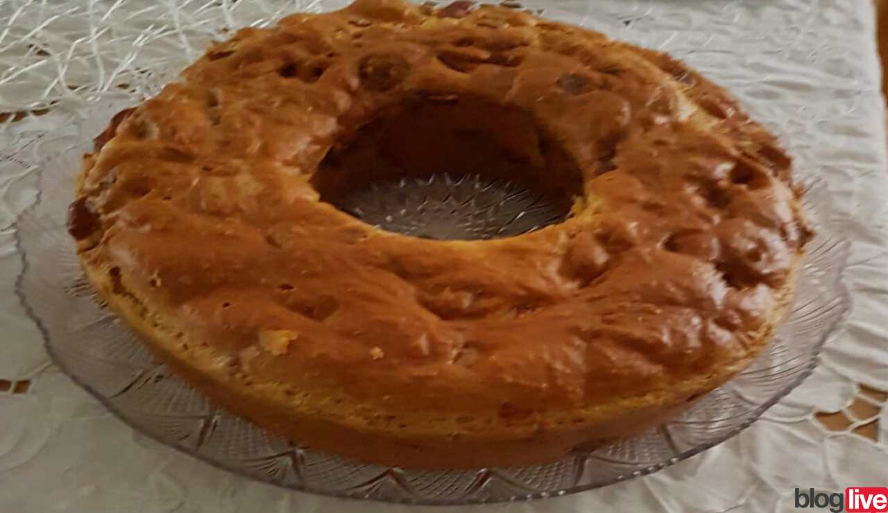 Prendete uno stampo da ciambellone con un diametro di 28cm circa, imburratelo ed infarinatelo, e versateci l’impasto. Coprite con la pellicola e fate lievitare per un’ora in forno spento con luce accesa. Passata l’ora tirate fuori lo stampo, togliete la pellicola ed infornatelo a 160° per un’ora circa. Per la cottura, regolatevi sempre con la prova dello stuzzicadenti. Una volta cotto, sfornate, lasciate riposare per un pò e servitevi. La ricetta è terminata.