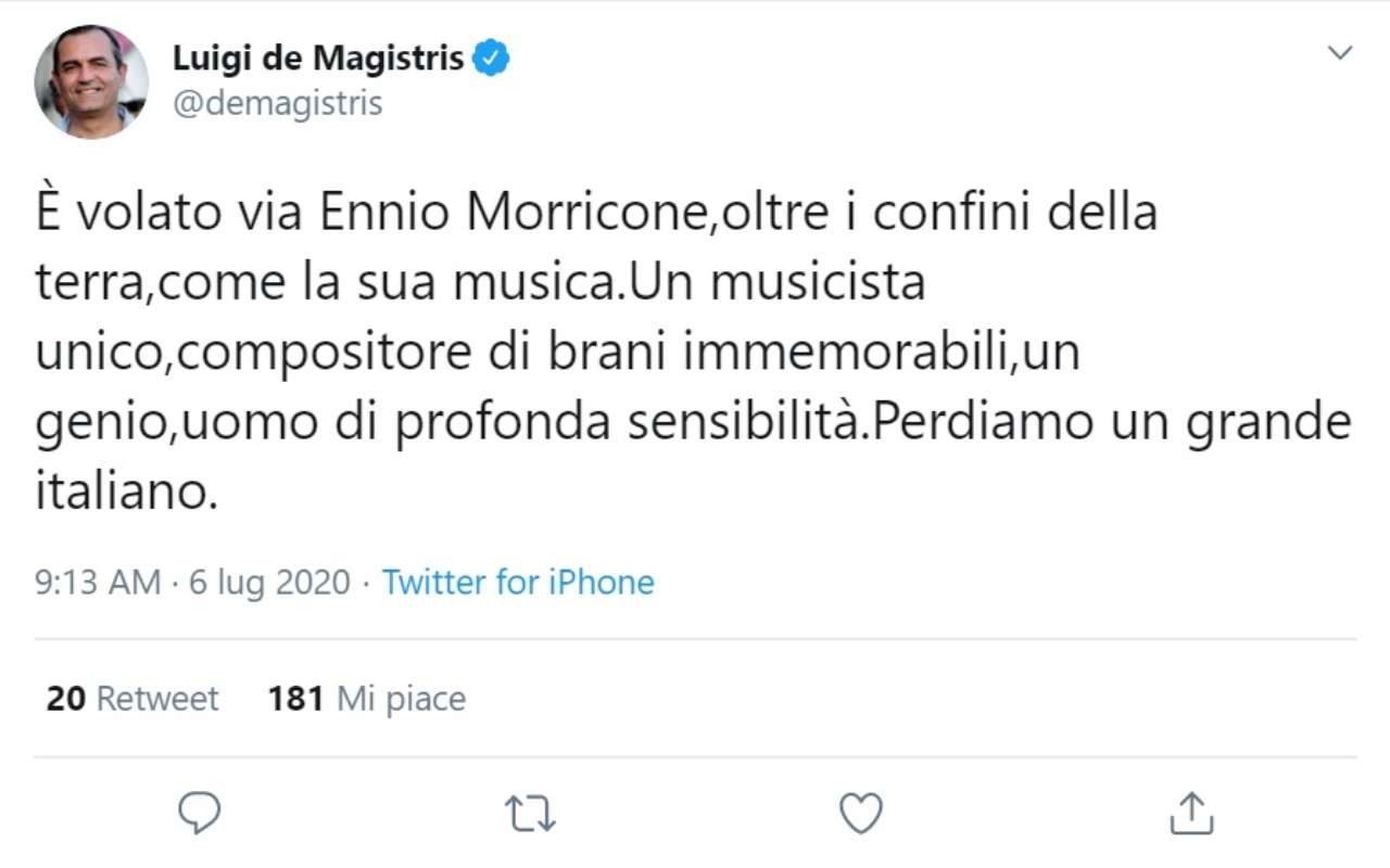 Il sindaco di Napoli Luigi De Magistris dedica un messaggio a Ennio Morricone, morto questa mattina a 93 anni: il tweet però contiene una gaffe che non passa inosservata