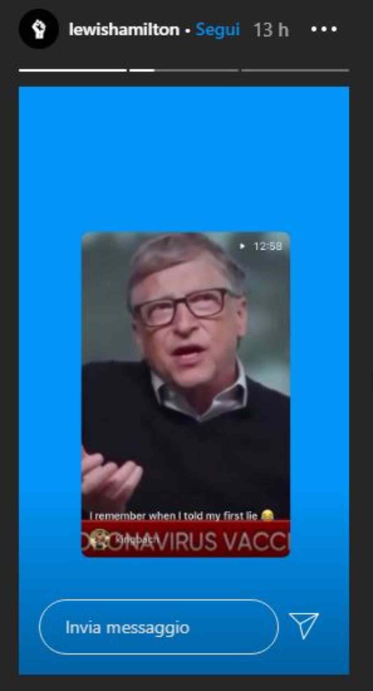 Il campione di Formula 1, Lewis Hamilton, pubblica sul proprio profilo Instagram una storia contro il vaccino per il Coronavirus, accusando Bill Gates