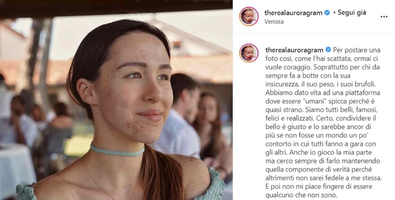 Aurora Ramazzotti continua la sua battaglia mediatica sui social, mostrandosi senza filtri. Basta filtri! In un’epoca di grandi cambiamenti per “Postare una foto così, come l’hai scattata – sostiene in un post condiviso sul suo profilo Instagram – ormai ci vuole coraggio”. La perfezione, così tanto osannata, non esiste. L’imperfezione è insita nell’essere umano, che deve accettare la sua fragilità e mostrarsi per quello che si è. Questa è la lezione che Aurora continua a trasmettere, mostrando tutti i suoi difetti quando posta video e foto, senza adoperare i filtri.