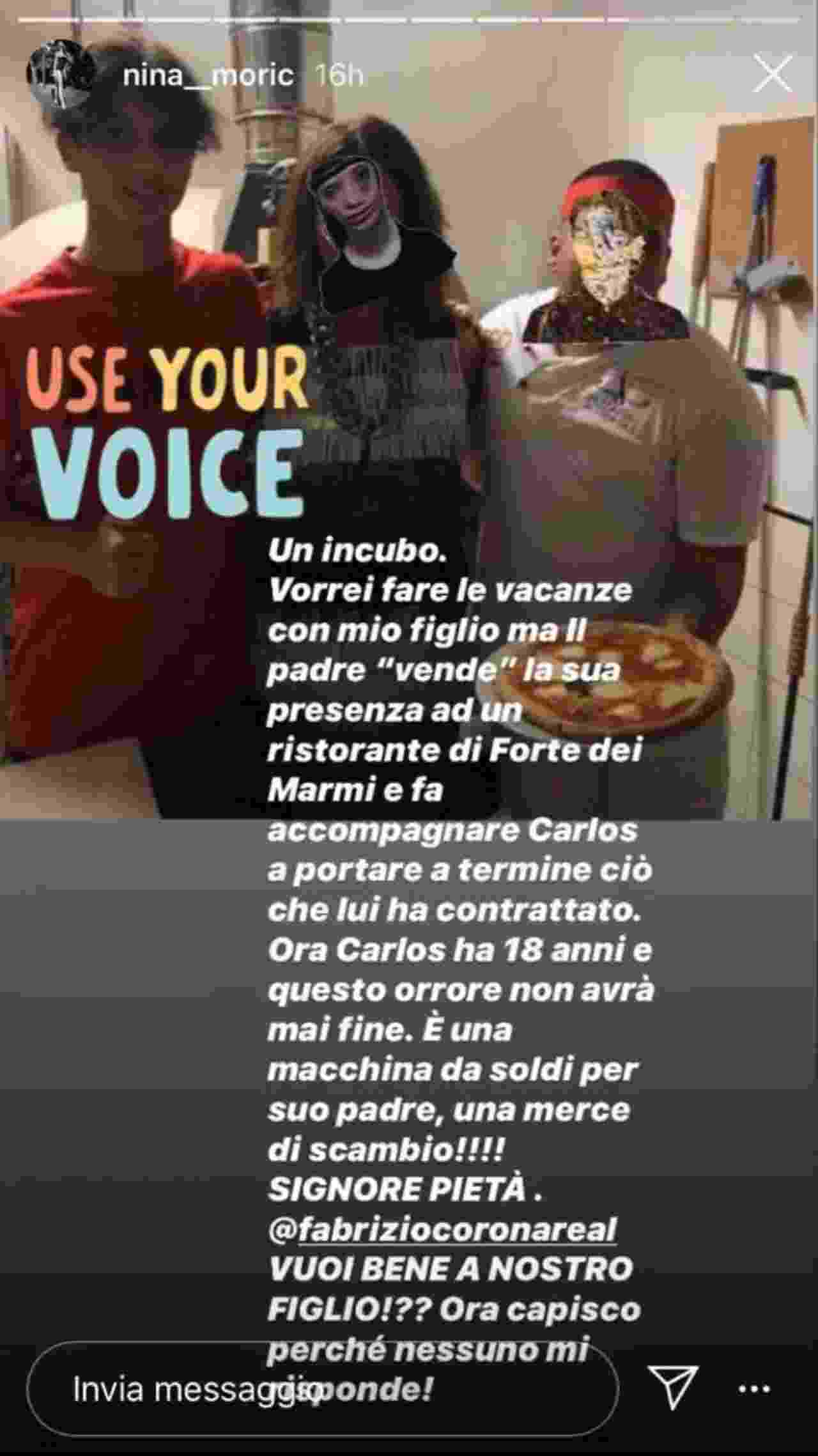 Sono molto pesanti le accuse rivolte a Fabrizio Corona dall’ex moglie Nina Moric. Inaccettabile il comportamento di Corona nei confronti del figlio Carlos.