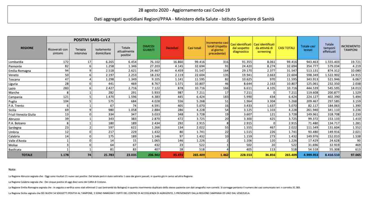 Il Ministero della Salute ha diffuso i dati relativi al bollettino sul coronavirus del 28 agosto. Si conferma l’andamento degli ultimi giorni con i contagi sopra quota mille e molti tamponi. Nel dettaglio i positivi del giorno sono 1.462, per un totale che sale a 265.409 casi dall’inizio della pandemia. Gli attualmente positivi sono 23.035 (+1.103), mentre i decessi delle ultime ventiquattro ore sono 9. In totale le vittime da inizio emergenza in Italia sono 35.472. Da mettere in evidenza il numero di tamponi, ancora un record: nelle ultime 24 ore sono stati ben 97.065.