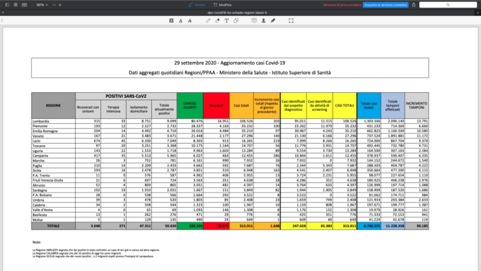 Il Ministero della Salute ha reso noto oggi martedì 29 settembre, il bollettino relativo ai casi da Coronavirus in Italia