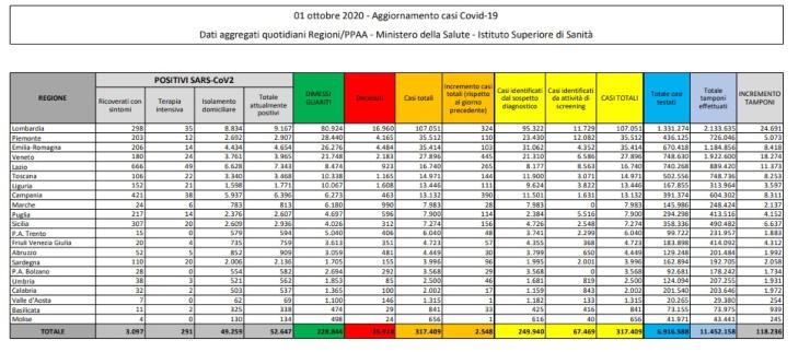 Il Ministero della Salute ha reso noto oggi giovedì 1 ottobre, il bollettino relativo ai casi da Coronavirus in Italia