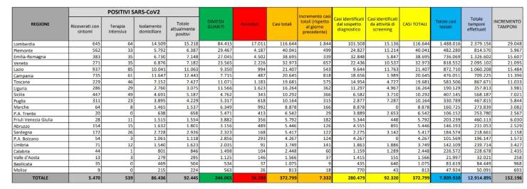Bollettino 14 Ottobre (Fonte Ministero della Salute)Il Ministero della Salute ha pubblicato i dati relativi ai contagi da coronavirus, del giorno 14 Ottobre 2020. Come riportato dall’Ente sanitario, il numero dei casi totali è salito a 372.799 (nonostante i 152.196 tamponi) con un incremento 7.332 casi. In aumento anche gli attualmente positivi: 92.445 unità (+ 5.252 rispetto a ieri). Purtroppo aumentano anche i soggetti ricoverati in terapia intensiva 539 che oggi arrivano a , con un aumento di 25 unità, rispetto a ieri. Il dato dei guariti ha raggiunto 244.065 con un aumento di 2.037 persone. Purtroppo anche il numero dei decessi registra una crescita, con 43 morti rispetto al giorno precedente, per un totale di 36.289 3