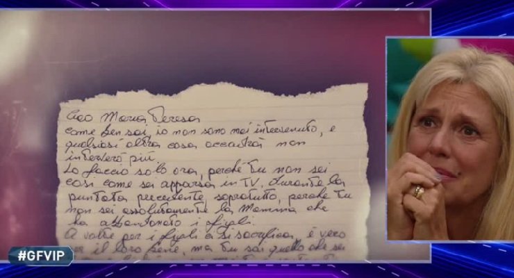 GF Vip Maria Teresa Ruta (Foto dal web)Continuano i colpi di scena al Grande Fratello Vip, Alfonso Signorini a Maria Teresa Ruta ha fatto arrivare una lettera scritta dal marito Roberto. L’uomo le ha dedicato parole speciali, l’ha elogiata sia come donna che come madre. Leggendo le parole del marito la gieffina non è riuscita a trattenere le lacrime per l’emozione.