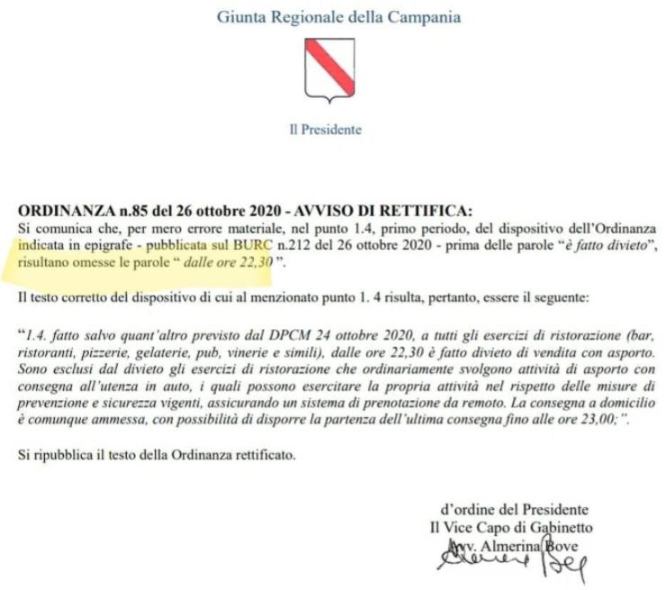 Torna la paura di un nuovo lockdown in Italia e le nuove restrizioni emanate dal Presidente del Consiglio Giuseppe Conte, sono una nuova mini chiusura. Tanti i settori colpiti dalle nuove chiusure, in particolare quello della ristorazione, che ha visto la chiusura anticipata, alle 18, di esercizi commerciali come bar, pub, ristoranti e pizzerie. Inoltre, dopo le 22.30 sarà vietata anche la vendita da asporto, cosa forse non proprio chiara alla Regione Campania. Infatti, il sito ufficiale della Regione Campania nel nuovo comunicato sulle restrizioni va contro quanto dichiarato dal Premier Conte. Infatti, nel primo comunicato si legge che ”è consentita la vendita da asporto dalle ore 22.30, cosa completamente opposta da quella decisa dal Governo. Fortunatamente dopo alcune ore e sicuramente diverse segnalazioni, arriva la correzione che rimette al loro posto le regole. Infatti nel nuovo comunicato arriva la correzione, ripetendo che “non è consentita la vendita da asporto dalle 22.30”. Sarebbe curioso sapere la reazione del Presidente De Luca alla gaffe della Regione.