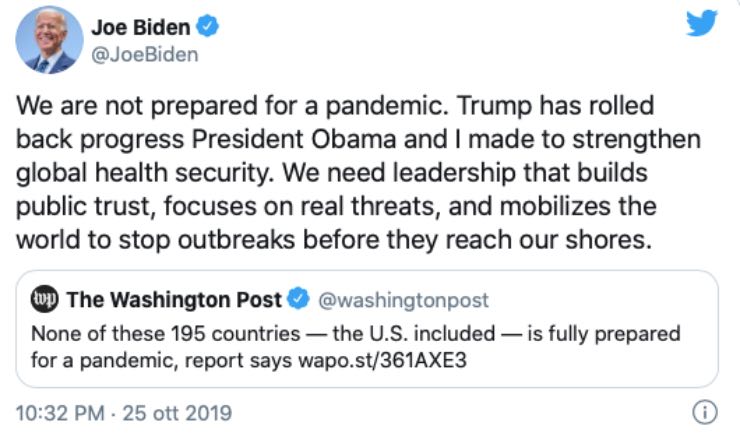 Era il 25 ottobre del 2019, poco più di un anno fa quindi, e l’attuale candidato democratico alla Casa Bianca scriveva così su Twitter: “Non siamo preparati ad una pandemia. Trump ha fatto regredire i risultati che io e il presidente Obama avevamo raggiunto per rinforzare la sicurezza sanitaria di tutti.”
