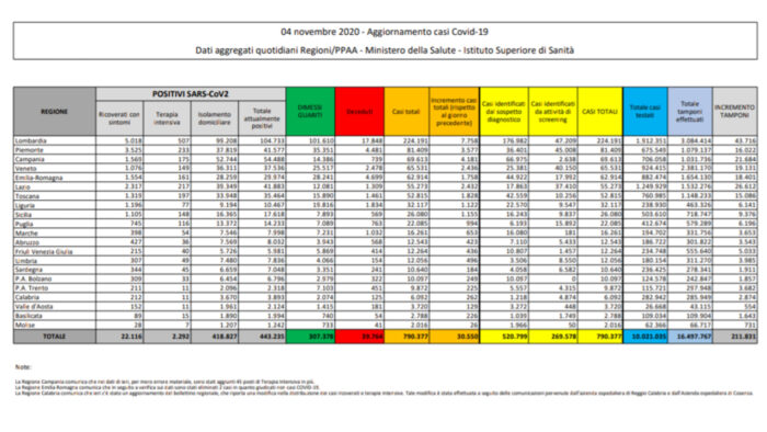 Il Ministero della Salute ha reso noto, tramite bollettino, i nuovi contagi relativi all’emergenza da Covid-19, aggiornati al 4 Novembre