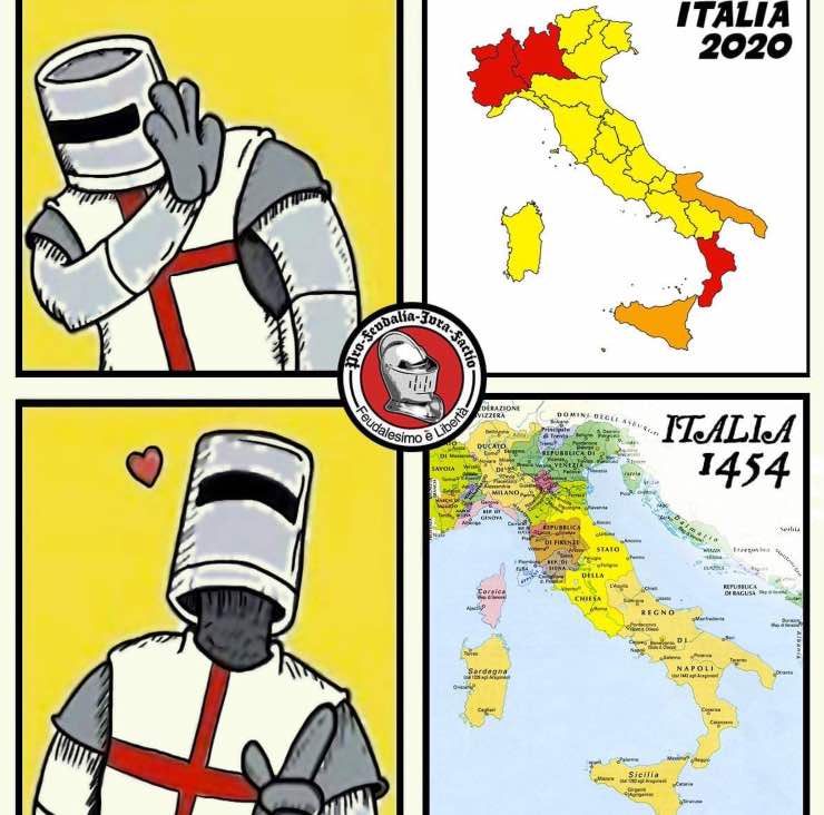 La maggior parte dei meme che circolano sul web hanno come “vittima” proprio Conte e la decisione del Governo di dividere l’Italia in zone di “pericolosità“. Le foto sono diventate virali nelle ultime ore, tanto che le pagine di satira politica, ma non solo, ne sono state invase. Aprendo Facebook e Instagram, ma anche Twitter, è impossibile non imbattersi in alcune di queste ma di seguito ne abbiamo raccolte alcune per darvi un’idea del clima che si respira sul web.