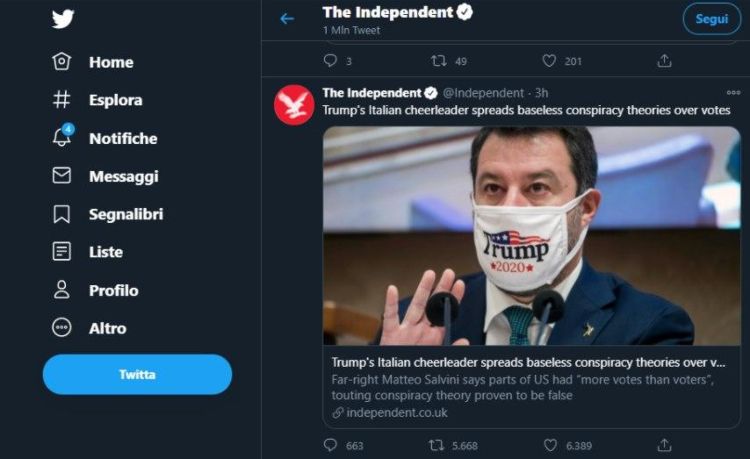 Proprio questa scelta ha attirato l’attenzione del quotidiano Independent, che gli ha dedicato un articolo con una frecciata molto forte nel titolo. Il leader della Lega Nord, che non viene menzionato per nome, viene infatti definito “la cheerleader italiana di Trump”. Nell’articolo si fa riferimento ad alcune affermazioni fatte dal senatore, che sostiene la tesi dei brogli elettorali portata avanti dal tycoon. In assenza di prove però il quotidiano definisce queste affermazioni “teorie del complotto senza nessun fondamento”.