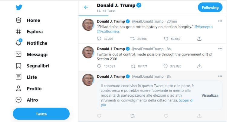 Per questo motivo su Twitter Trump ha lanciato dure accuse contro il sistema di voto nello stato. Ha infatti riportato una dichiarazione secondo cui Filadelfia, capitale della Pennsylvania e città simbolo degli States, avrebbe una tradizione di manipolazione delle elezioni. Più o meno allo stesso tempo la piattaforma social ha oscurato alcuni tweet del tycoon. Al loro posto infatti compare un avviso secondo cui i suoi post contengono informazioni false sulle elezioni in corso.