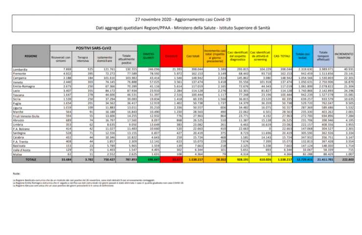 Il Ministero della Salute ha appena pubblicato il bollettino del 27 Novembre. I casi di contagio dall’inizio dell’emergenza sono saliti a 1.538.218 con un incremento di 28.352 unità rispetto a ieri. In calo rispetto a ieri, gli attualmente positivi che ad oggi ammontano a 787.893 (– 7.952). I guariti giungono a 696.647 con un incremento di 35.467 unità. Nelle ultime 24 ore si sono registrati 827 decessi che hanno portato il bilancio totale a 53.677