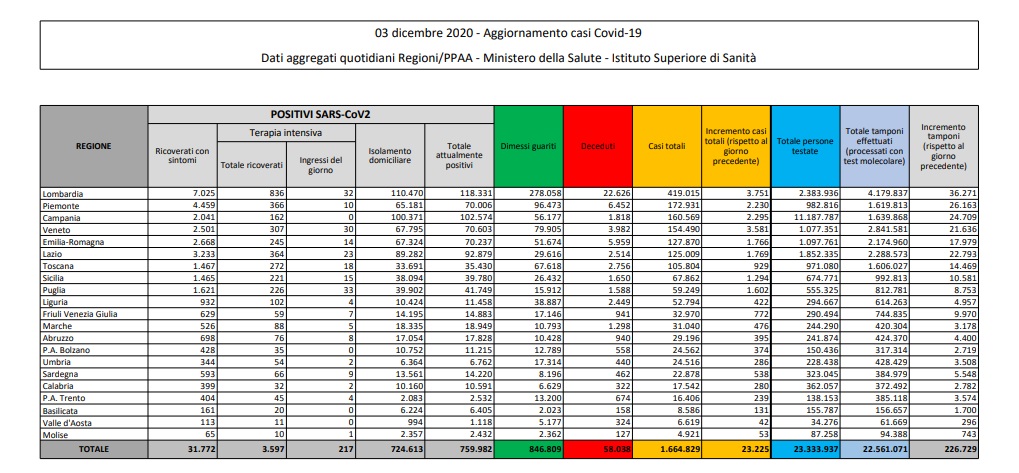 Il Ministero della Salute ha reso noti i dati dell’epidemia da Covid-19, aggiornati al 3 Dicembre, tramite il consueto bollettino.