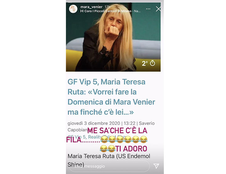 Lo scoop però è che Maria Teresa Ruta avrebbe messo gli occhi su Domenica In della Venier. La zia di Rai Uno non si è lasciata sfuggire questa chicca e le ha risposto su Instagram. In una stories Mara posta l’articolo che riprende la notizia e scrive “mi sa che c’è la fila” e a dire il vero sono tantissimi i pretendenti al “trono“.