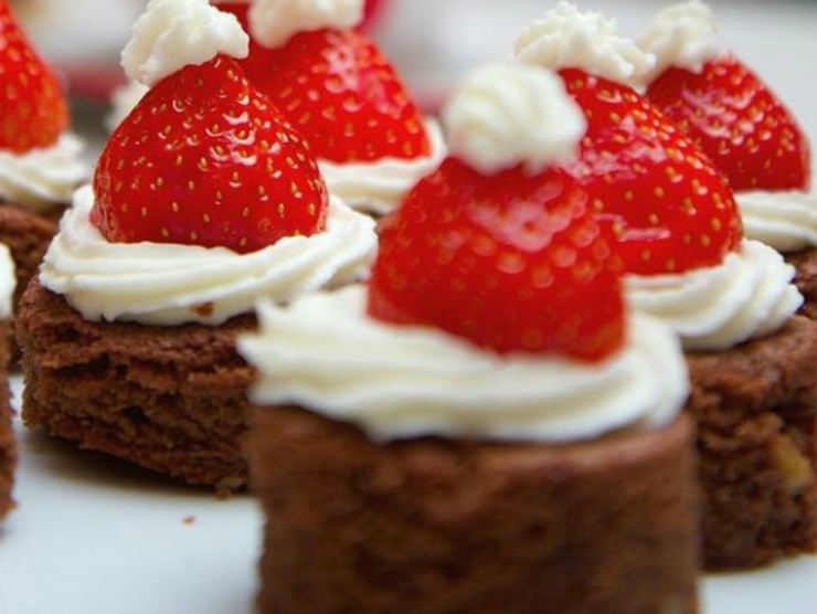Ora, aiutandovi con un bicchierino o formina rotonda, ricavate dei cerchi di torta che andrete poi a guarnire con la fragola o lampone. Ottenuti i cerchi, adagiatevi sopra la frutta e guarnitela con la panna montata. I vostri dolcetti per Natale sono pronti per essere gustati.