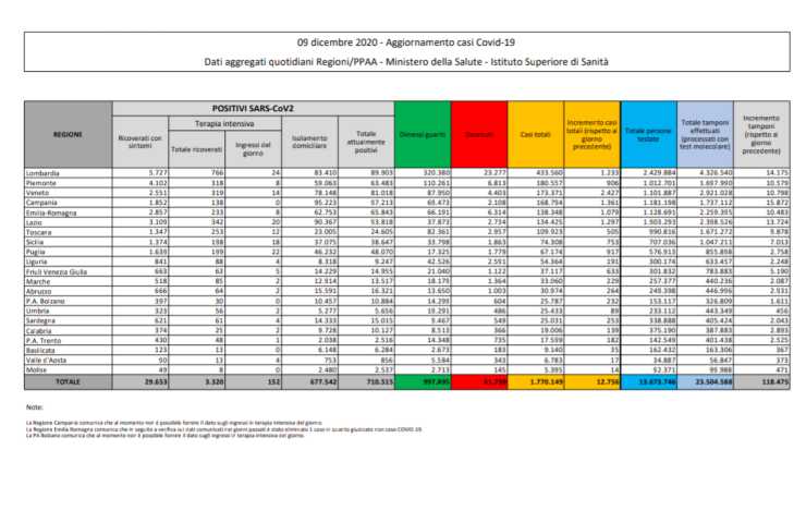 Il Ministero della Salute ha reso noti, tramite il consueto bollettino, i dati dell’epidemia da Covid-19 aggiornati al 9 Dicembre