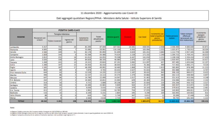 Il Ministero della Salute ha reso noti, tramite il consueto bollettino, i dati dell’epidemia da Covid-19 aggiornati al 11 Dicembre