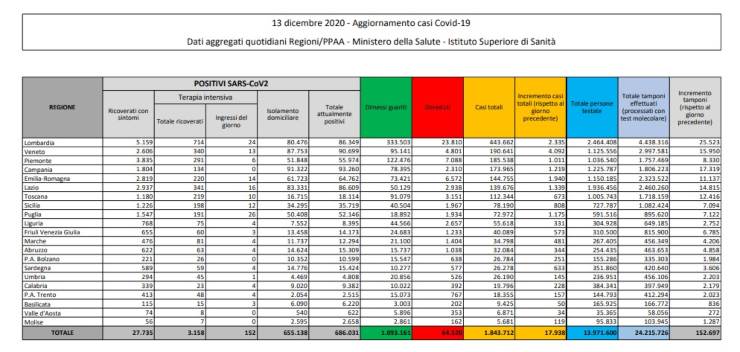 Il Ministero della Salute ha reso noti, tramite il consueto bollettino, i dati dell’epidemia da Covid-19 aggiornati al 13 Dicembre.
