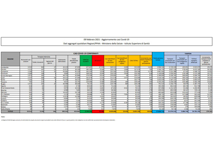 Il Ministero della Salute ha reso noti, tramite il consueto bollettino, i dati dell’epidemia da Covid-19 aggiornati al 9 Febbraio.