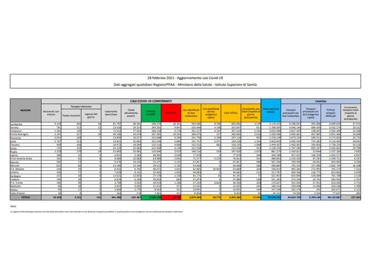 Il Ministero della Salute ha reso noti, tramite il consueto bollettino, i dati dell’epidemia da Covid-19 aggiornati al 28 Febbraio.