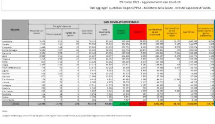I dati dell’epidemia da Covid-19 aggiornati al 9 Marzo 2021 sono stati resi noti dal Ministero della Salute tramite il quotidiano bollettino.