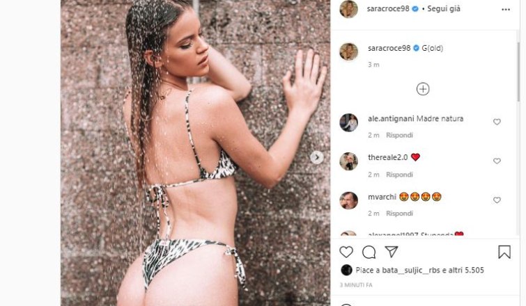 Sara Croce è tornata in tv a vestire i panni della Bonas nel mini-mondo di Avanti un Altro, il quiz di Canale 5 condotto da Paolo Bonolis. Qui siamo abituati a vederla in abiti striminziti che mettono in risalto il suo fisico statuario. Tuttavia, la modella classe ’98 è su Instagram che dà il meglio di sé. Qui oggi pomeriggio ha pubblicato una coppia di scatti mentre fa la doccia. Temperature bollenti nel giro di qualche minuto sul profilo della ragazza.