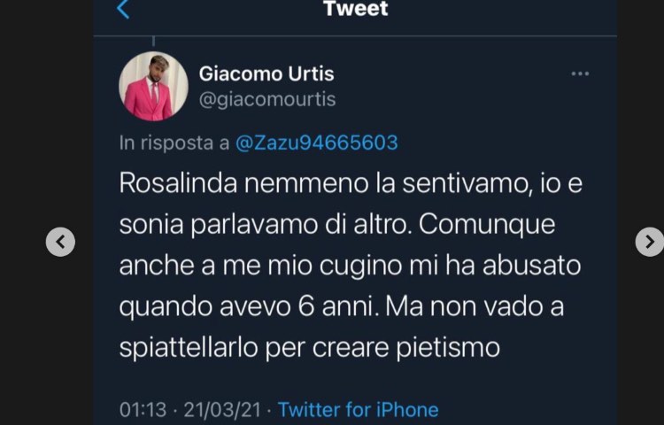 “Mi hai mostrato pubblicamente poco tatto – ha scritto Rosalinda – tirando fuori un argomento che, essendo stato anche tu un bambino abusato, è davvero delicato”. Poi continua sulle sue esternazioni, che Urtis aveva in pratica definite di pietismo: “Il fatto che il mio raccontare abbia dato il coraggio a tante donne, per me rende il tuo commento alquanto ridicolo”. Dopo la seconda storia di Adua però, sono arrivate le scuse di Giacomo, che ha messo fine alla polemica, almeno per il momento. “se il mio tweet è stato interpretato in maniera sbagliata mi dispiace”.