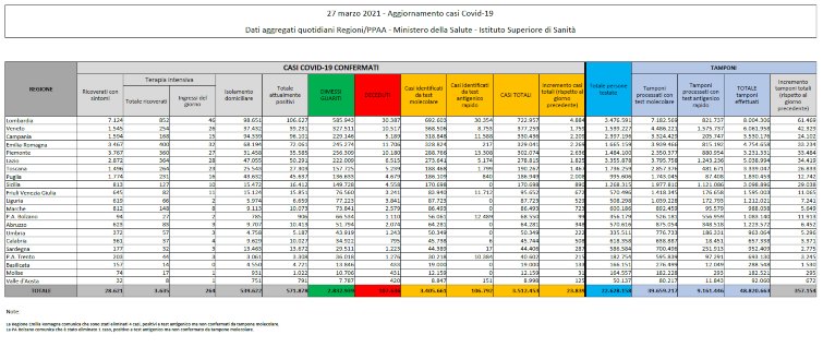 Spaventano anche i dati di Piemonte, Puglia, Emilia Romagna e Campania, abbondantemente sopra i 2mila. Nel frattempo da martedì scatteranno le nuove fasce di colore in attesa della zona rossa totale delle festività pasquali. Promosso in arancione soltanto il Lazio, dove proseguono a tamburo battente anche la campagna vaccinale. Vanno invece in la Valle d’Aosta, la Campania e la Toscana. Quest’ultima al centro di alcune polemiche sollevate in questi giorni sull’andamento dei vaccini. Qui sarebbero state favorite alcune categorie professionali rispetto agli anziani e alle persone fragili, lasciati in coda alle liste d’attesa.