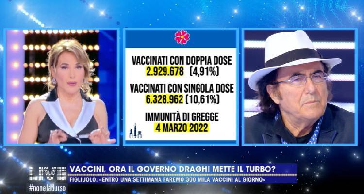 In studio Barbara d’Urso ha mostrato un grafico il quale dimostra che continuando con l’attuale gestione si arriverà all’immunità non prima di un anno, a marzo 2022. Dati che hanno infastidito non poco Al Bano, in studio è infatti sbottato. A detta sua non gli sta bene sentire che l’immunità arriverà a marzo del 2022, ha poi aggiunto che si arrabbia.