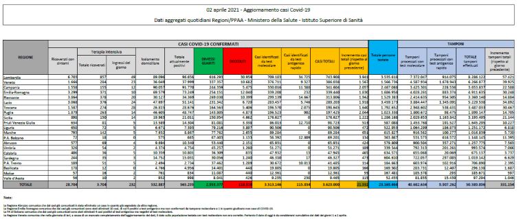 Sul fronte vaccini, le persone che in Italia hanno ricevuto entrambe le dosi sono 3,3 milioni. In totale sono invece state somministrate 10,5 milioni di dosi. A metà aprile dovrebbe cominciare la somministrazione del siero monodose Johnson&Johnson che, stando al piano vaccinale, potrebbe dare lo sprint alla campagna di vaccinazione di massa.