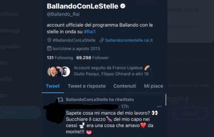 Una gaffe bella e buona per il social media manager di Ballando con le stelle. Il noto programma Rai è amatissimo in tv e seguitissimo anche sui social, ma un errore è costato caro sul profilo ufficiale di Twitter. L’episodio risale a ieri sera, quando inspiegabilmente l’account di Ballando ha retwittato un commento di un post, fatto da parte di un follower. Niente di strano fino a qui, se non fosse che il commento era particolarmente volgare – per usare un eufemismo.