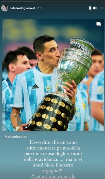 Per questo motivo, Belen poche ore fa ha voluto dedicare loro alcune parole attraverso un Instagram Story. L’argentina ha confessato di essersi addormentata per via della gravidanza e, quindi, di non aver visto la partita. Ecco che cosa ha scritto: