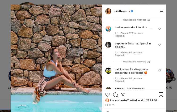 “E’ salita la temperatura della piscina”, scherza un fan, e ancora: “Meravigliosa”, “Divina”. Sono solo alcuni dei 900 e più commenti già comparsi sotto l’ultima foto di Diletta. Anche il numero dei like è spaventoso, 223mila in due ore, a conferma ancora una volta il dominio della showgirl suoi social network. Nella giornata di ieri la Leotta si era immortalata, sempre a bordo piscina, insieme a l’amica Lorenza Di Prima.