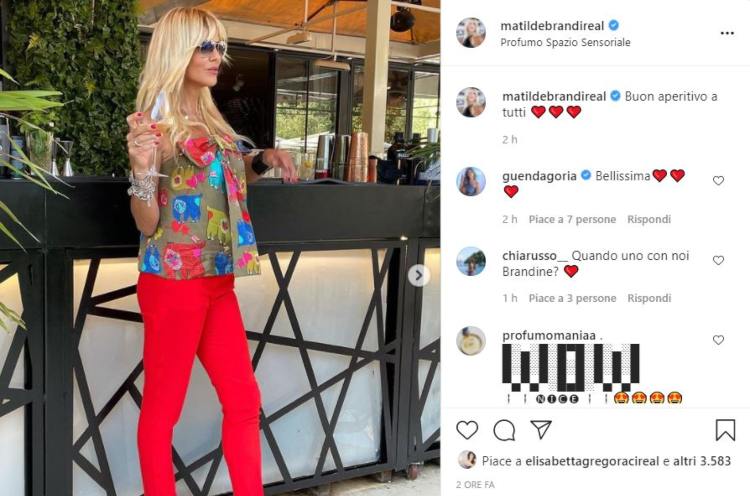 Matilde Brandi si concede un aperitivo molto “infuocato”: col pantalone rosso, attillato, augura buona serata a tutti. Che stacco di gamba!