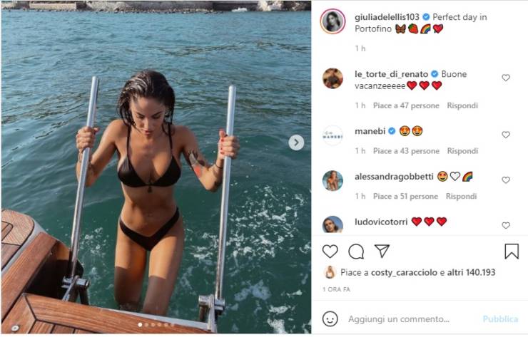 Nell’ultimo post pubblicato, invece, la De Lellis ha esibito una serie di scatti da paura. Nel primo è intenta a scendere le scalette della barca per tuffarsi in mare; indossa un bikini nero che mostra nitidamente il tatuaggio al centro del décolleté e mette in evidenza la sua bellezza, accentuata dalla seconda immagine, in cui è bagnata con le mani nei capelli, per un effetto davvero devastante.