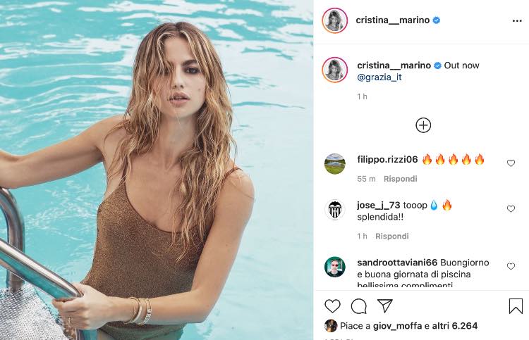 Prosegue l’estate di Cristina Marino, che come tante colleghe influencer non ha fatto mancare la sua vicinanza ai fan anche nei periodi più intensi di relax. Dalle coste della Puglia la modella si è mostrata spesso in costume, da spiagge, scogliere, piscine, sfruttando le meravigliose location salentine. Insieme a Nina – Luca Argentero non si è ancora fatto vivo sul suo profilo – e in solitaria, tanti gli scatti arrivati nelle ultime settimane, ma quello di oggi è in qualche modo unico.