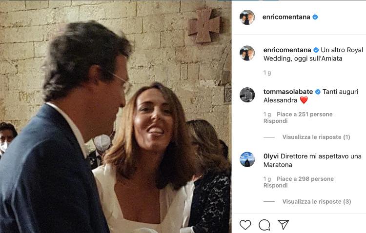 Le nozze si sono tenute in provincia di Siena, mentre nella didascalia Mentana è così intervenuto: “Un altro Royal Wedding, oggi sull’Amiata”, e ancora: “Però una mezza maratona l’avrei fatta. Con Marco da Milano che commenta l’abito e che conosce tutti gli invitati uno per uno compresa la nonna della Sardoni”.