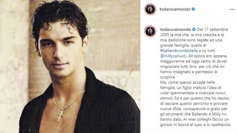 Parole accorate e di ringraziamento nei confronti di tutta la produzione del programma e in primis in quelli di Milly Carlucci. “All’epoca ero appena maggiorenne – scrive Todaro – ma come spesso accade nelle famiglie un figlio matura l’idea di voler sperimentare e ricercare nuovi stimoli”. Un’anticipazione, quindi, del fatto che il prossimo futuro dell’artista sarà interessato da una nuova esperienza in tv.