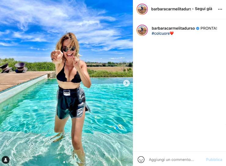 Anche oggi, come sempre mattiniera, la conduttrice condivide un nuovo post su Instagram, dove è molto attiva e vanta oltre 2,7 milioni di followers. In bikini all’interno della piscina mostra i pugni in versione combattente, ma l’occhio del popolo dei social cade inevitabilmente lì.