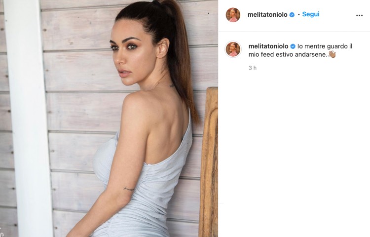Di profilo, con uno sguardo ipnotico fuori camera, la modella si mostra in un vestitino attillato da far perdere il fiato. Outfit da sogno per l’ex diavolita, che in didascalia interviene: “Io mentre guardo il mio feed estivo andarsene!”, con tanto di emoticon.