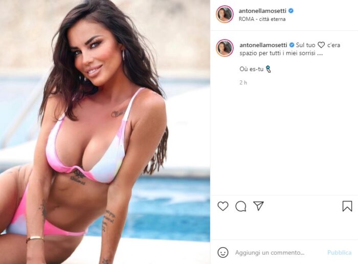 Eccola qui, dunque, la nota opinionista che da anni è presente nei salotti di Canale 5, mentre è a bordo piscina. Come potete vedere bene dallo screenshot del post riportato nell’articolo, Antonella porta un bikini bianco e rosa e sorride ammiccante a chi la guarda.