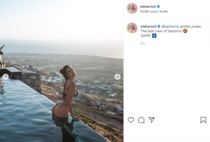 Eccola qui, dunque, l’influencer che decide di mostrare ancora una volta il suo lato B. Questa volta lo fa da una piscina panoramica a Santorini, in Grecia. Mentre lei esce dall’acqua con un costume che la copre ben poco, davanti a lei l’incantevole isola.