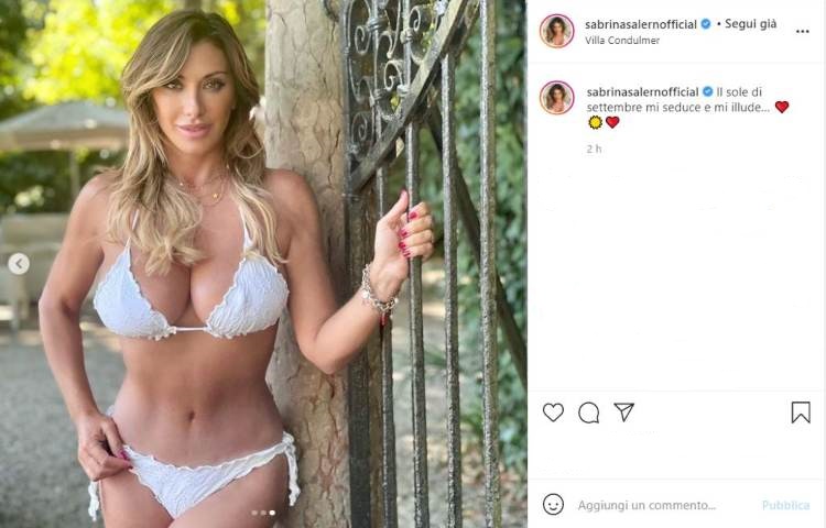 Sabrina Salerno si presenta ancora una volta con un bikini bianco a dir poco esplosivo: il sole di settembre batte tutto su di lei. E non copre nulla!